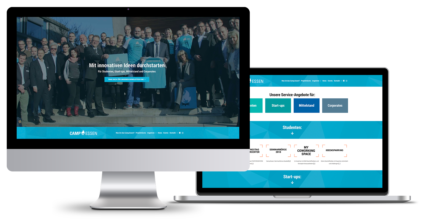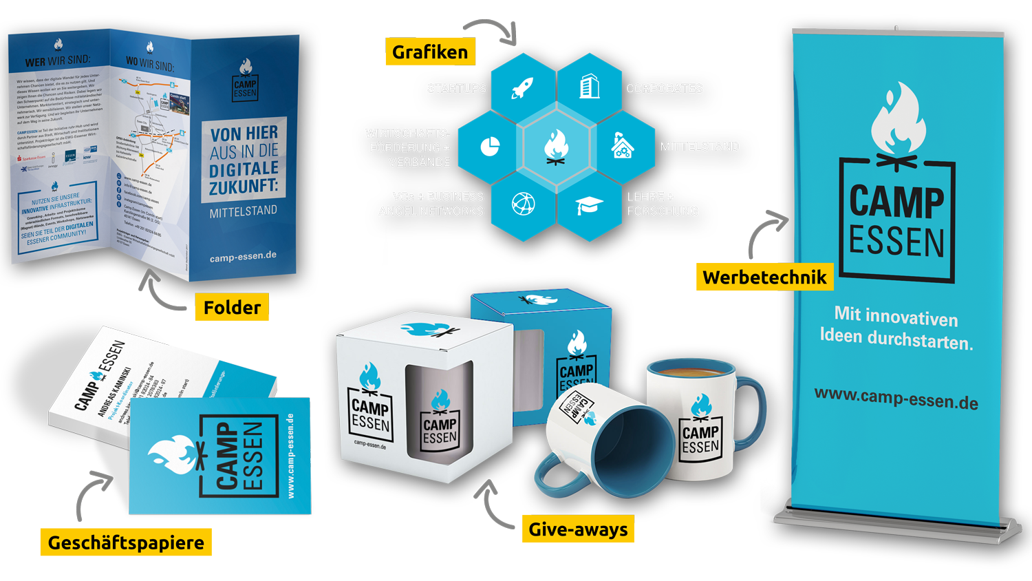 Das Camp.Essen bietet Gründungsinteressierten, Start-ups und Vertretern von Unternehmen und Konzernen den notwendigen Raum, sich fit für die Zukunft zu machen. Dieser eröffnet sich in Workshops, Vorträgen und einem Coworking-Space. Für die Inititative entwickelten wir das Corporate Design. Außerdem gestalteten wir die Webseite, entwickelten Social-Media-Kampagnen und entwarfen und realisierten vielfältige Merchandise-Artikel.
